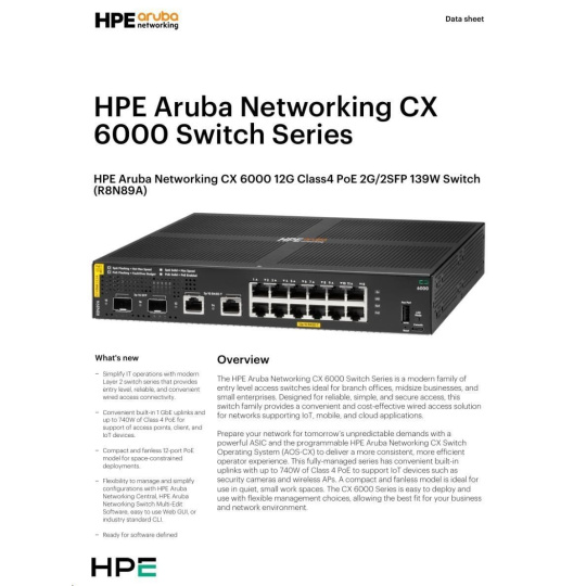 HPE Aruba Networking CX 6000 12G Class4 PoE 2G/2SFP 139W Switch.