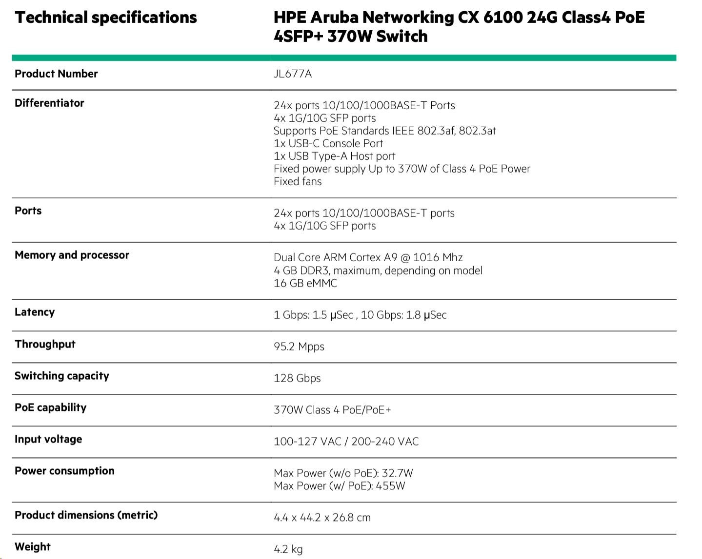 | Specifications | Aruba 6100 24G Class4 PoE 4SFP+ 370W Switch (JL677A) |
