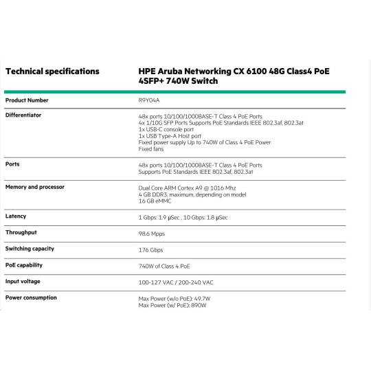 HPE Aruba Networking CX 6100 48G Class4 PoE 4SFP+ 740W Switch