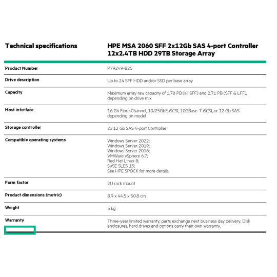 HPE MSA 2060 SFF 2x12Gb SAS 4-port Controller 12x2.4TB HDD 29TB Storage Array.