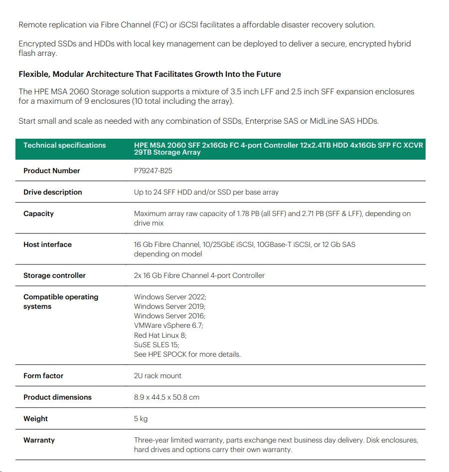 HPE MSA 2060 SFF 2x16Gb FC 4-port Controller 12x2.4TB HDD 4x16Gb SFP FC XCVR 29TB Storage Array.