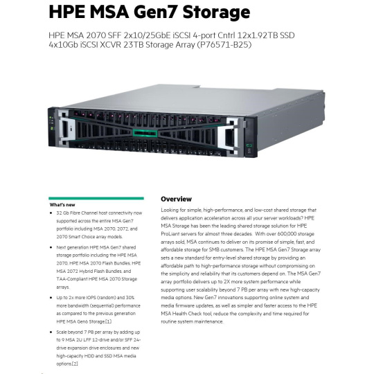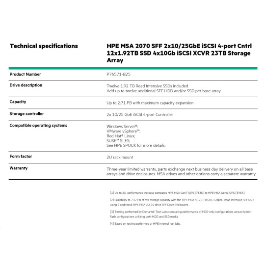 HPE MSA 2070 SFF 2x10/25GbE iSCSI 4-port Cntrl 12x1.92TB SSD 4x10Gb iSCSI XCVR 23TB Storage Array.