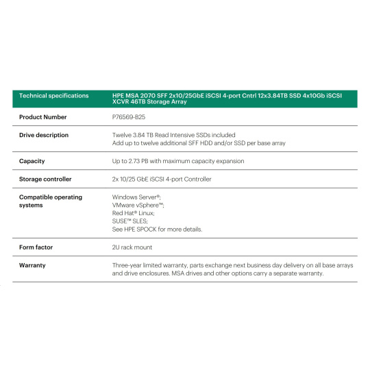 HPE MSA 2070 SFF 2x10/25GbE iSCSI 4-port Cntrl 12x3.84TB SSD 4x10Gb iSCSI XCVR 46TB Storage Array Smart Choice