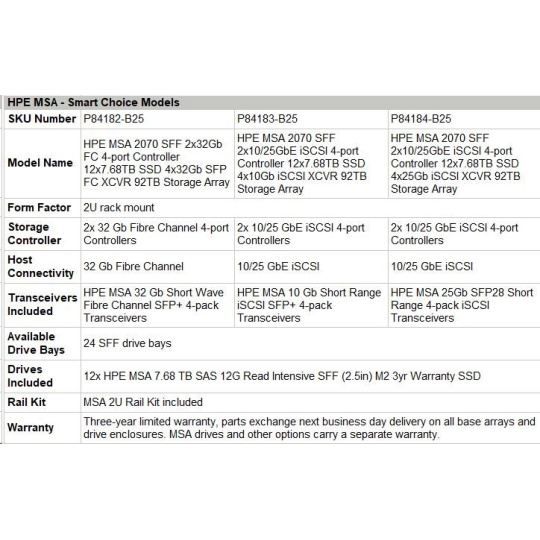 HPE MSA 2070 SFF 2x10/25GbE iSCSI 4-port Controller 12x7.68TB SSD 4x25Gb iSCSI XCVR 92TB Storage Array Smart Choice.