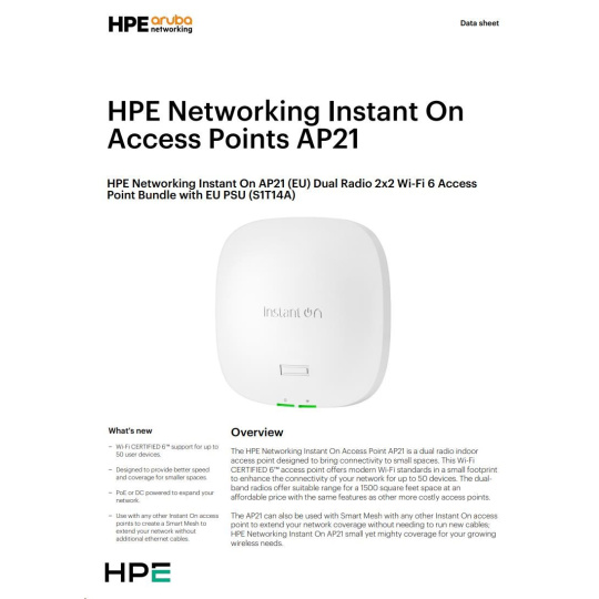 HPE Networking Instant On AP21 (EU) Dual Radio 2x2 Wi-Fi 6 Access Point Bundle with EU PSU