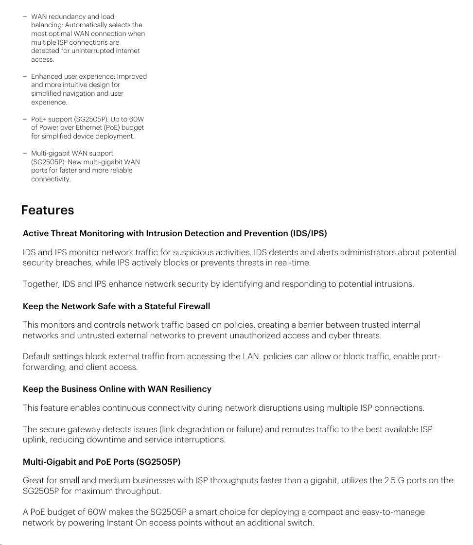 HPE Networking Instant On Secure Gateways poskytujú širokú škálu pokročilých technických funkcií navrhnutých na zvýšenie výkonu siete a zlepšenie bezpečnosti pre SMB. Jednou kľúčovou funkciou je VPN, ktorá zabezpečuje šifrovanú komunikáciu medzi miestami cez Instant On Secure Gateway, čo umožňuje podnikom bezpečne prepojiť viacero lokalít. Okrem toho, zabudovaný systém na detekciu a prevenciu narušení (IDS/IPS) aktívne monitoruje sieťovú prevádzku na podozrivé aktivity a automaticky blokuje škodlivý obsah, čím zabezpečuje integritu obchodných dát. A s automatickými aktualizáciami firmvéru, ktoré udržiavajú bezpečnostné záplaty aktuálne, a s ľahko použiteľným správou cez cloudový portál Instant On a mobilnú aplikáciu, je správa bezpečnejšej siete jednoduchšia než kedykoľvek predtým. Brána tiež podporuje odolnosť WAN cez funkcie failover, čo zabezpečuje plynulú prevádzku siete aj počas výpadkov ISP.