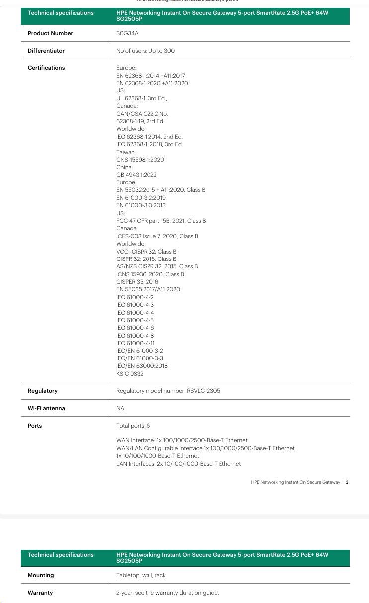 Pre väčšie prostredia ponúka HPE Networking Instant On Secure Gateway SG2505P päť portov, z ktorých dva poskytujú podporu pre multimediálne gigabity. Jeden multi-gig uplink (WAN), jeden multi-gig konfigurovateľný port (WAN/LAN), jeden gig konfigurovateľný port (WAN/LAN) a dva gig porty (LAN). SG2505P má podporu PoE s celkovým rozpočtom energie 64W na napájanie sieťových zariadení, ako sú Instant On prístupové body. S throughputom firewallu 2,3 Gbps je táto brána ideálna pre podniky, ktoré vyžadujú viac ako 1 gigabit celkovej priepustnosti od ISP. Či už ste malý obchod, ktorý chce udržať sieť jednoduchú, alebo start-up zameraný na AI s veľkými dátovými záťažami, SG2505P vám pomôže zostať pripojení a zabezpečení.