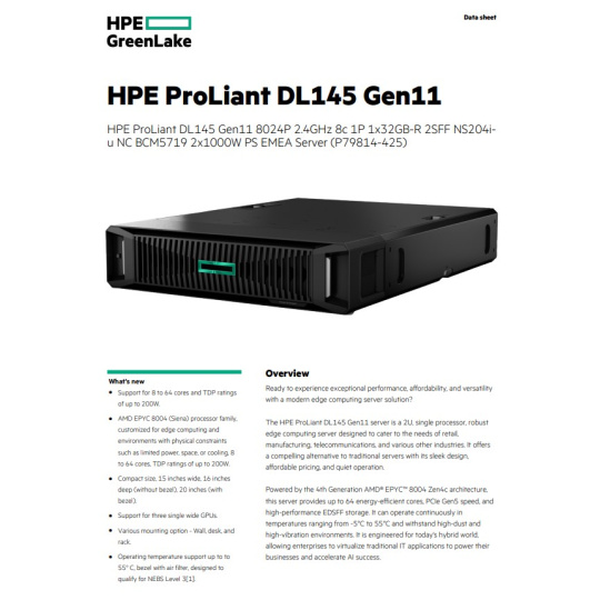 | Chassis | HPE ProLiant DL145 Gen11 Configure-to-order Server |