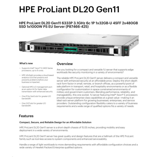HPE PL DL20 gen11 6333P (3.1G/6C12T) 1x32G 4SFF 2x480GB VROC 1x1000W 4x1G NBD333 Smart Choice.