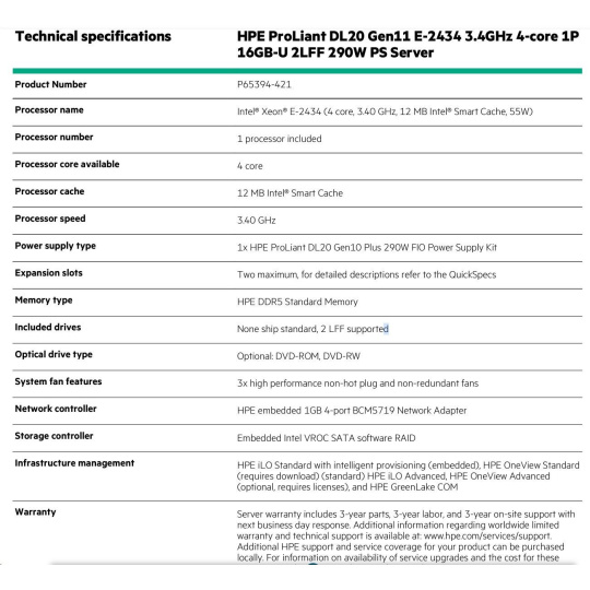 HPE PL DL20g11 E-2434 (3.4G/4C) 16G (P64336) 2LFF-HP 290W 4p1G
