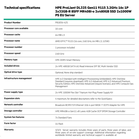 HPE PL DL325g11 AMD Epyc 9115 (2.6/16C) 2x32G (P64985) 2x480G 2x1000W MR408i-o/4G 8SFF 4p1Gocp Smart Choice