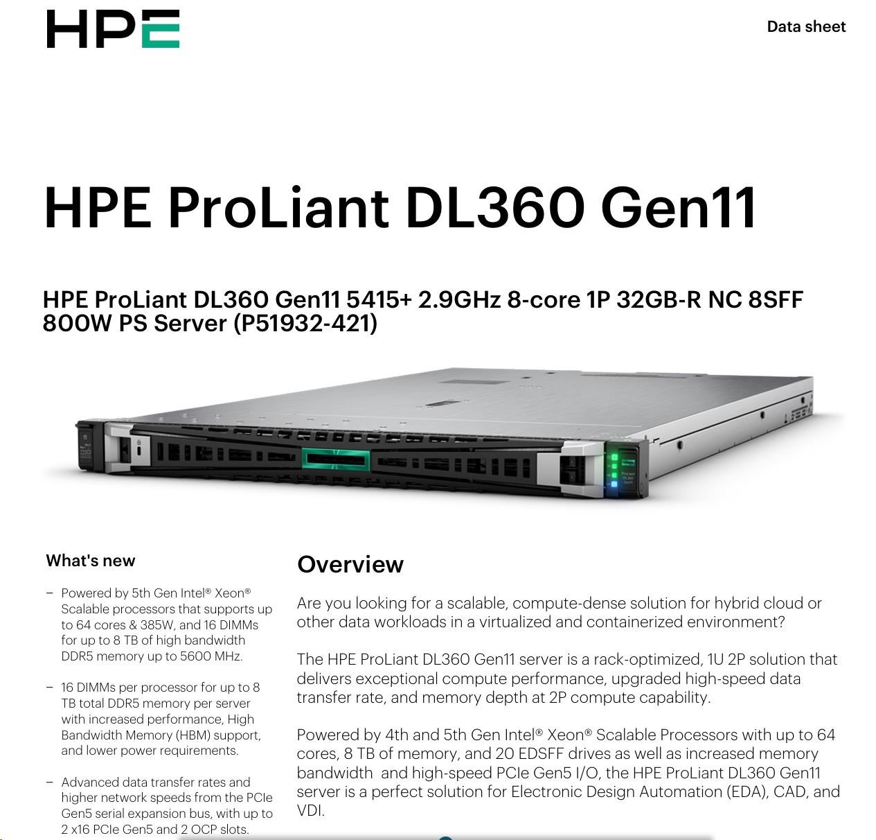 Model Name HPE ProLiant DL360 Gen11 5415+ 2.9GHz 8-core 1P 32GB-R NC 8SFF 800W PS Server
