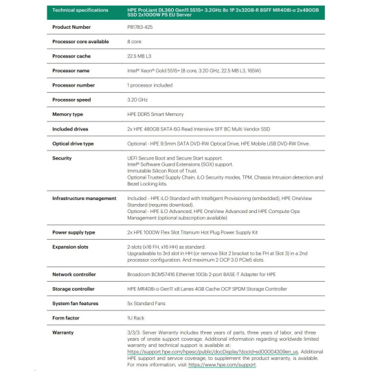 HPE PL DL360g11 5515+ (3.2G/8C) 2x32G (P64706) 8SFF MR408i-o/4G 2x480G 2x1000W 2x10G-T.