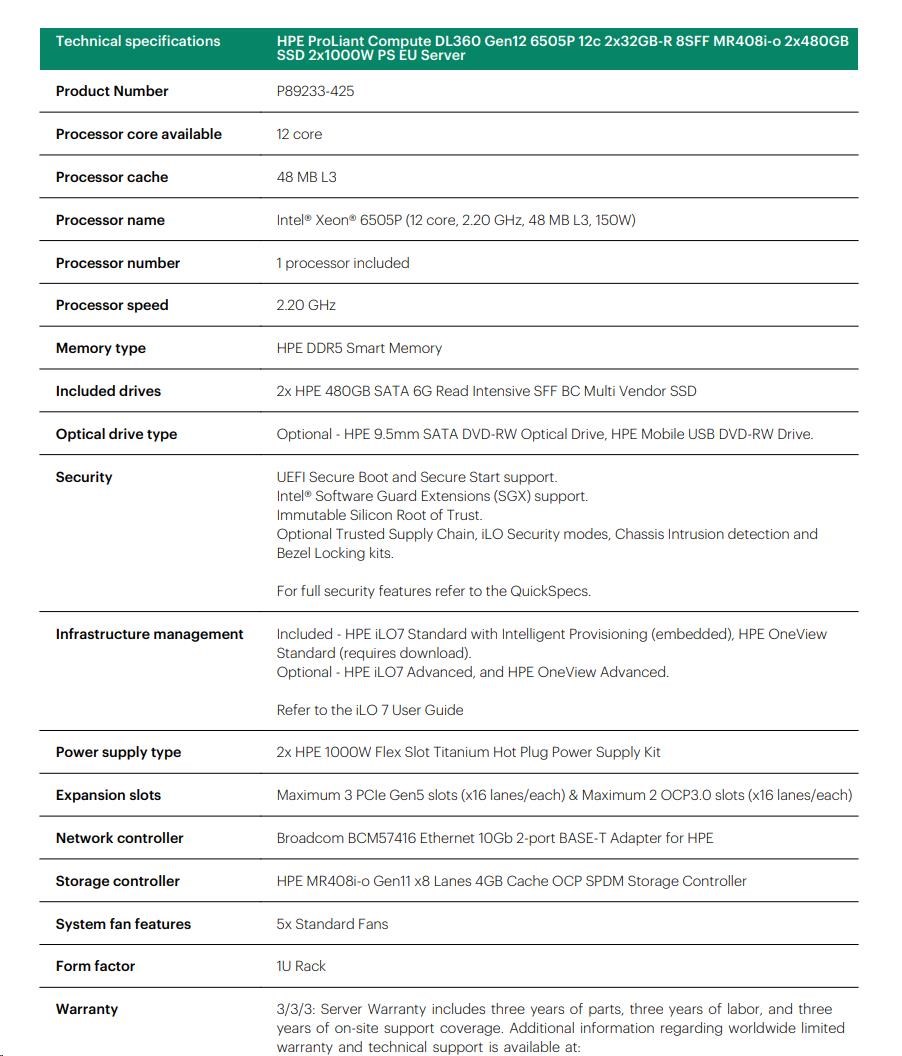 HPE PL DL360g12 6507P (3.5G/8C) 2x32G (P69727) 2x480G MR408i-o 8SFF 2x1000W 10GbE NBD333 Smart Choice.
