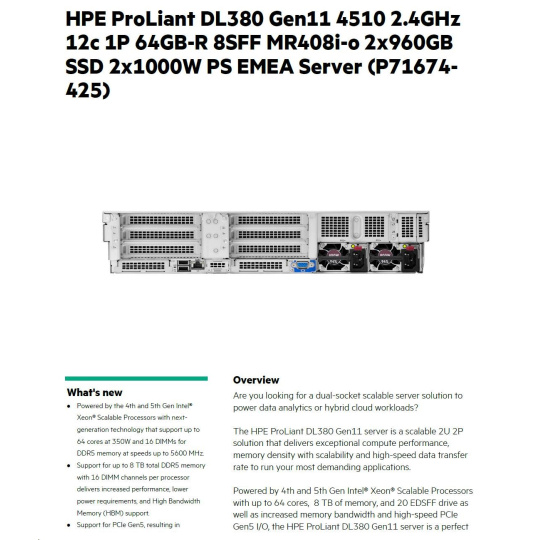 Model Name HPE PL DL380g11 4510 (2.4/12C) 2x32G 2x960G 8SFF MR408i-o 2x1000W 4x1Gb NBD333