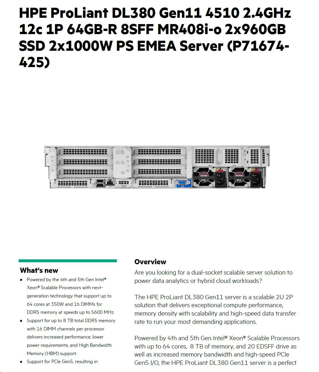 Model Name HPE PL DL380g11 4510 (2.4/12C) 2x32G 2x960G 8SFF MR408i-o 2x1000W 4x1Gb NBD333