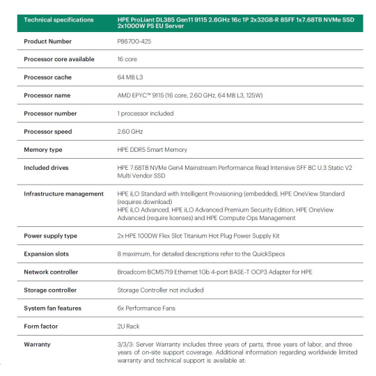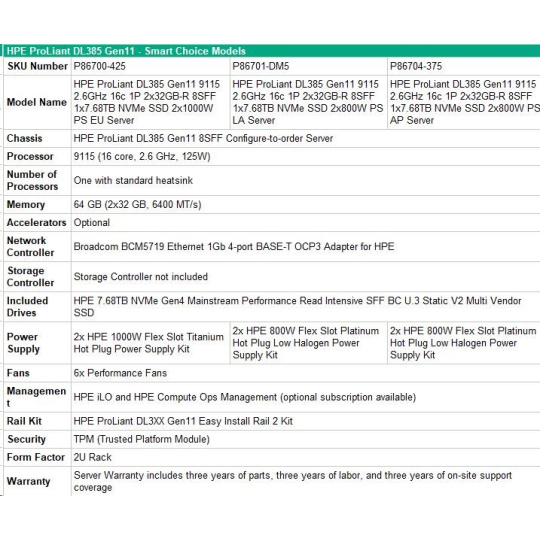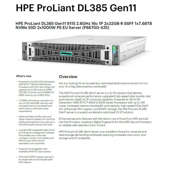 HPE PL DL385g11 AMD EPYC 9115 (2.6/16C) 2x32G (P64985) 1x7.68TB NVMe 2x1000W 8SFF 2p10GT Smart Choice.