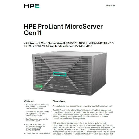 | P74439-425: HPE ProLiant MicroServer Gen11 G7400 2c 16GB-U 4LFF-NHP 1TB HDD 180W Ext PS EMEA Cmp Module Server |
