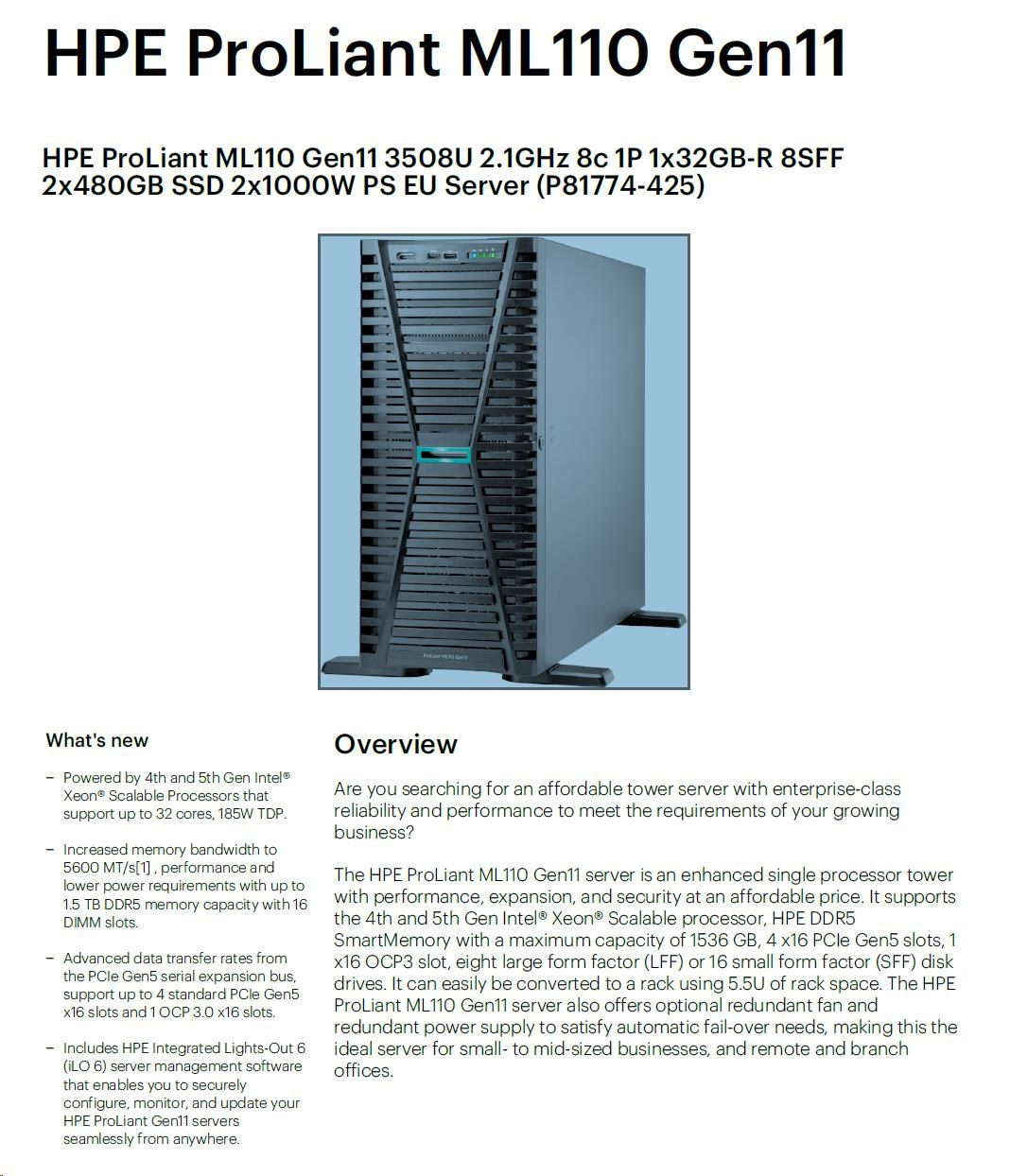 | Model Name | HPE ProLiant ML110 Gen11 3508U 2.1GHz 8c 1P 1x32GB-R 8SFF 2x480GB SSD 2x1000W PS EU Server |