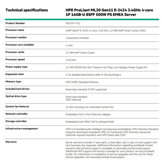 Technical specifications HPE ProLiant ML30 Gen11 E-2434 3.4GHz 4-core 1P 16GB-U 8SFF 500W PS EMEA