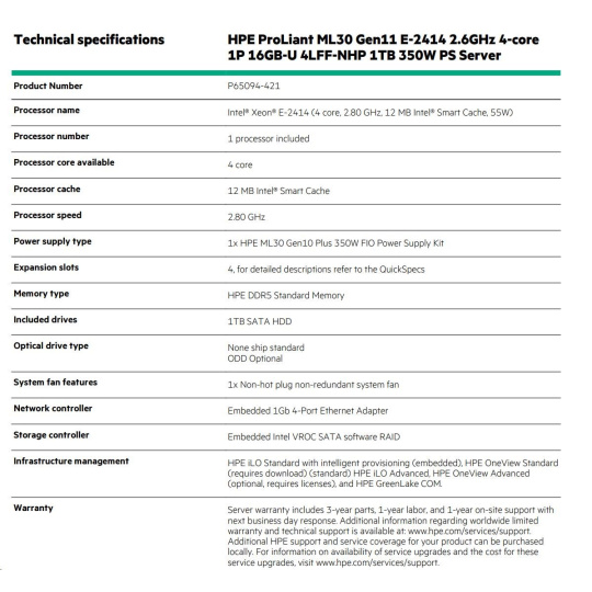 | Model Name | HPE ProLiant ML30 Gen11 E-2414 2.6GHz 4-core 1P 16GB-U 4LFF-NHP 350W PS Server |