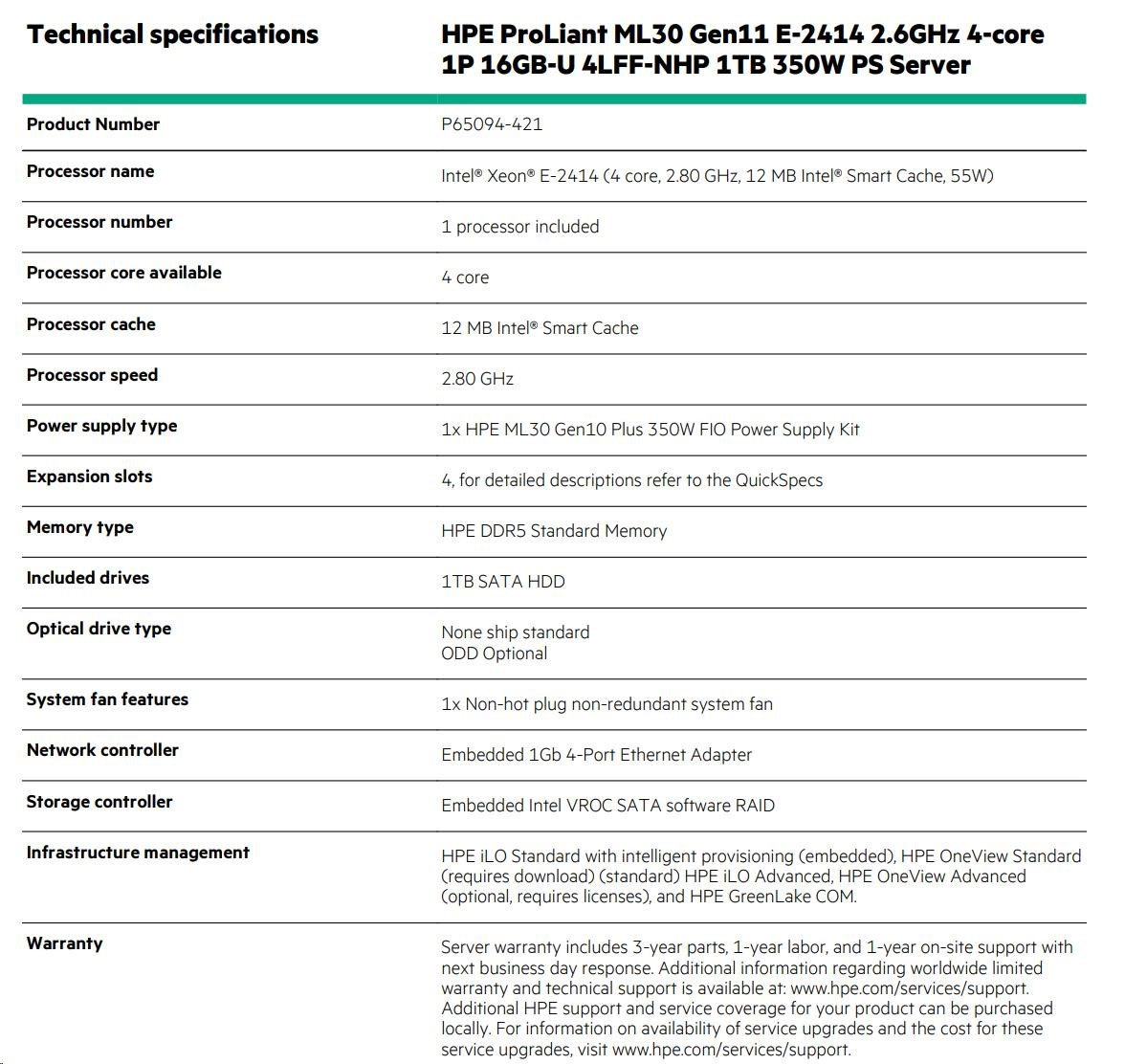 | Model Name | HPE ProLiant ML30 Gen11 E-2414 2.6GHz 4-core 1P 16GB-U 4LFF-NHP 350W PS Server |