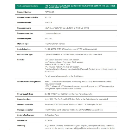 HPE PL ML350 Gen12 6515P (2.4/16C) 1x64G (P69728) 2x480G MR408i-o 8SFF 2x1000W 1GbE NBD333 Smart Choice.