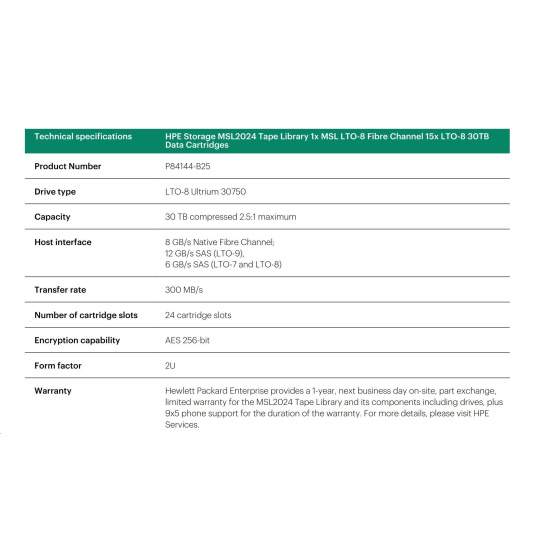 HPE Storage MSL2024 Tape Library 1x MSL LTO-8 Fibre Channel 15x LTO-8 30TB Data Cartridges