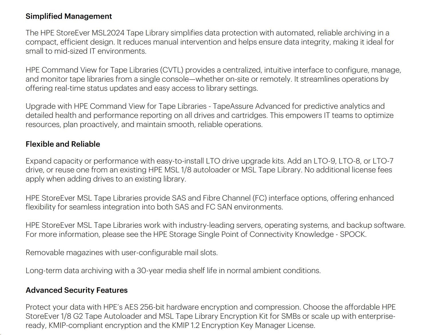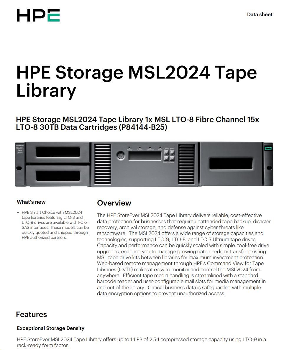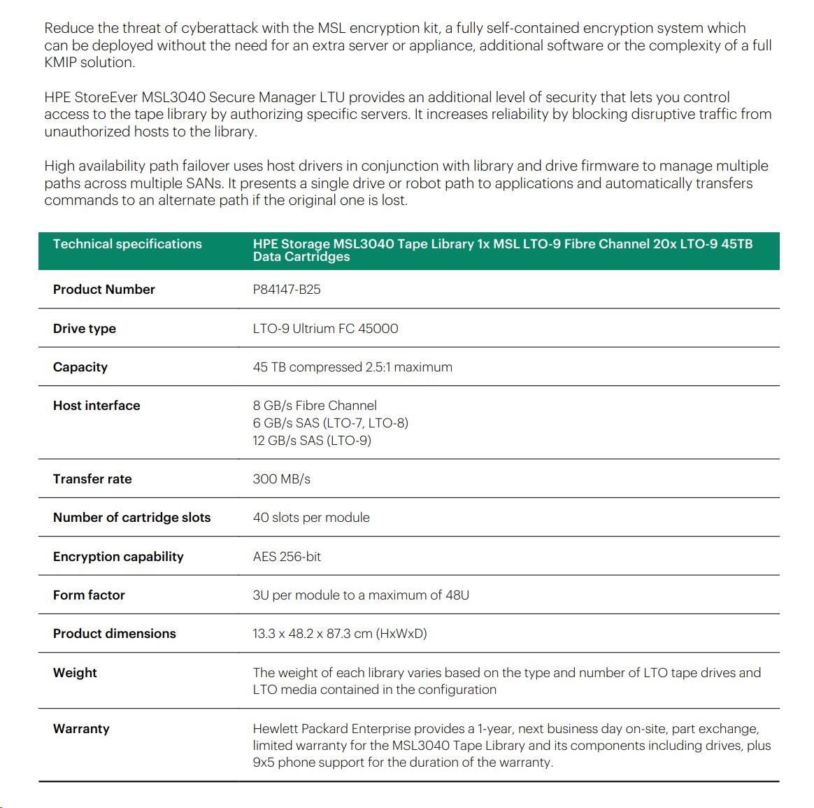 HPE Storage MSL3040 Tape Library 1x MSL LTO-9 Fibre Channel 20x LTO-9 45TB Data Cartridges