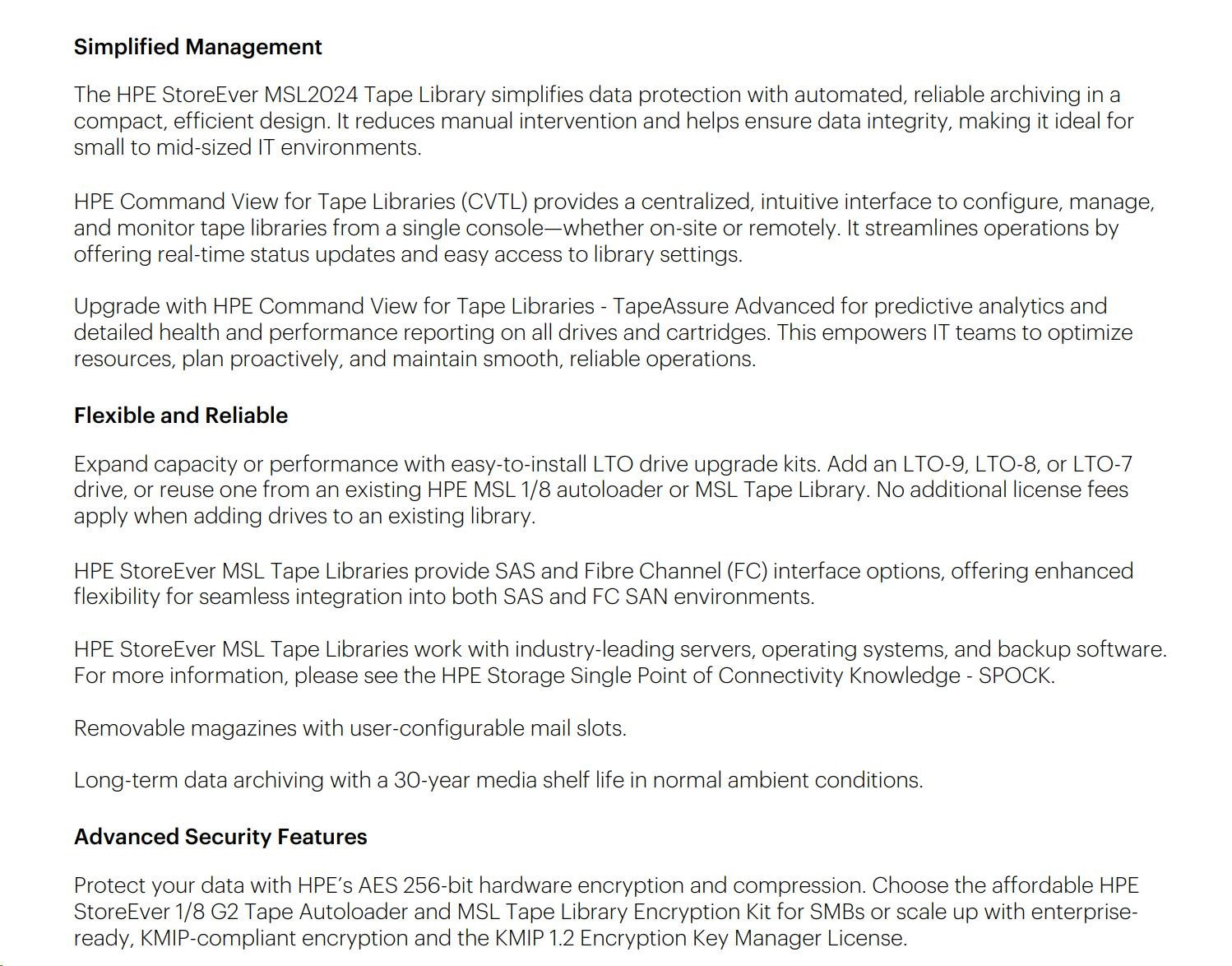 The MSL2024 Tape Library offers a broad choice of storage capacity and technology including LTO-9, LTO-8, or LTO-7 Ultrium tape drives. HPE's web-based remote management solution Command View for Tape Libraries (CVTL) makes the MSL2024 Tape Library easy to manage from any remote location, eliminating the need for remote office IT staff.