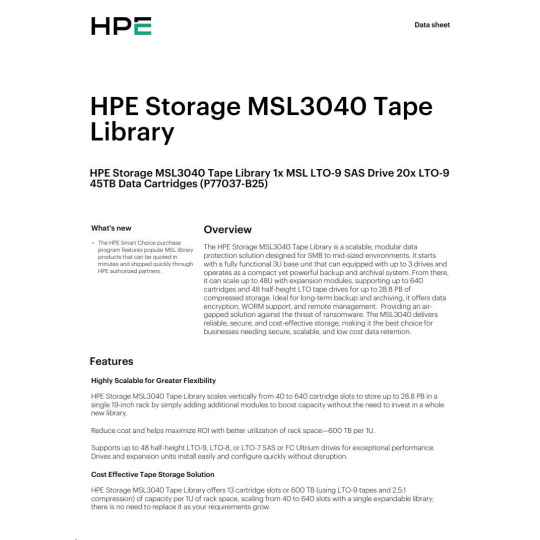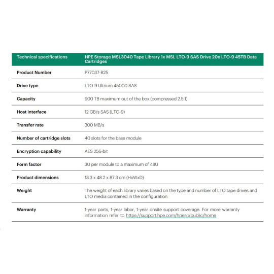 HPE Storage MSL3040 Tape Library 1x MSL LTO-9 SAS Drive 20x LTO-9 45TB Data Cartridges
