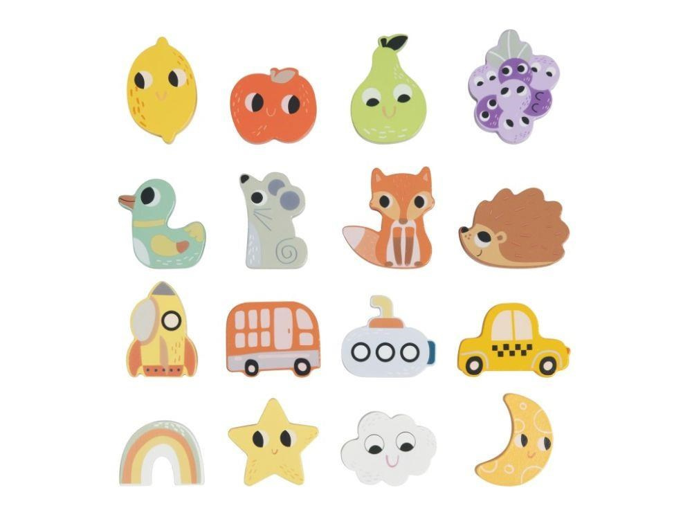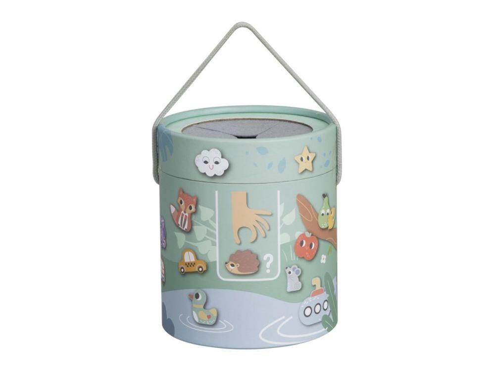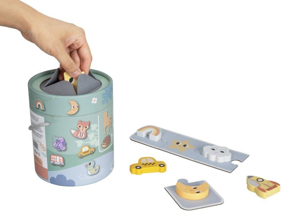 Spoločenská hra pre Deti aj celú rodinu Hmatej a nájdi ponúka veľa zábavy a možností na hranie. Hra, ktorá dokonale potrénuje a zdokonalí motorické zručnosti, spočíva v hľadaní správneho dreveného predmetu v kyblíku, keď musí hráč nájsť požadovaný tvar iba hmatom. Hru môžete hrať rôznymi spôsobmi a prispôsobiť ju veku i zručnostiam každého hráča. Užite si spoločné chvíle pri hmataní a hľadaní zvieratiek, dopravných prostriedkov a ďalších tvarov.