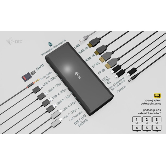 Dokovacia stanica s najvyšším možným výkonom! Podporuje až šesť externých monitorov* s rozlíšením 4K/60 Hz. Alebo dvaja môžu bežať súčasne aj v rozlíšení 8K! Ideálny produkt pre používateľov, ktorí požadujú viacero monitorov, bez toho aby museli robiť kompromisy v oblasti stability obrazu, rozlíšenia a obnovovacej frekvencie. Dokovacia stanica je tiež vybavená portom pre rýchle nabíjanie USB-C (s nabíjacím výkonom až 30 W), najmä pre nabíjanie smartphonov a tabletov, rýchlymi portami USB, portom LAN 2,5 Gbps a ďalšími perifériami.