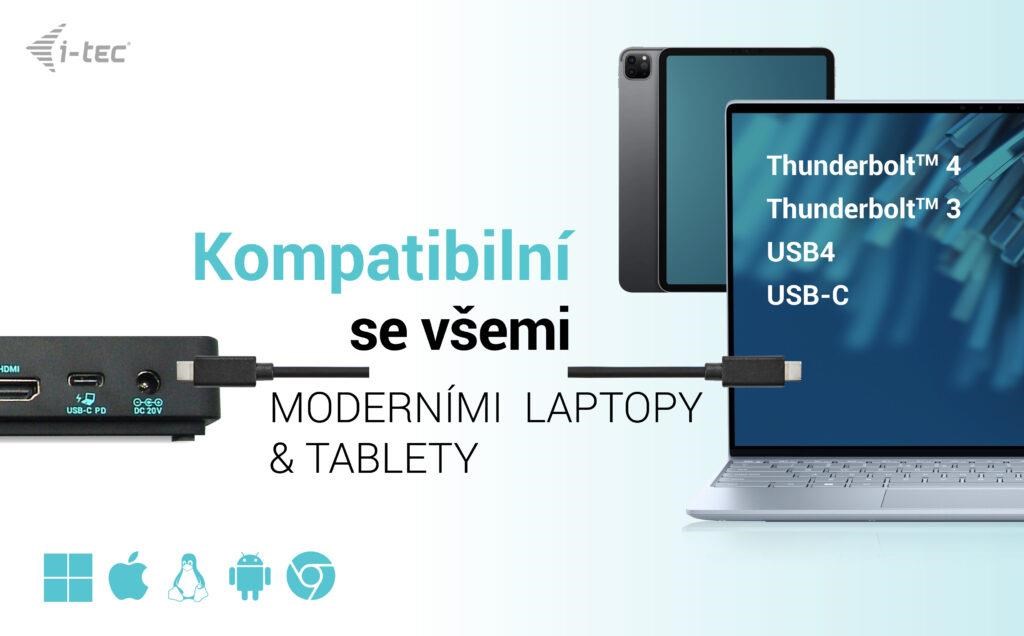- Dokovacia stanica je kompatibilná so všetkými modernými notebookmi vybavenými portmi USB-C, USB4 alebo Thunderbolt™ 3/4.