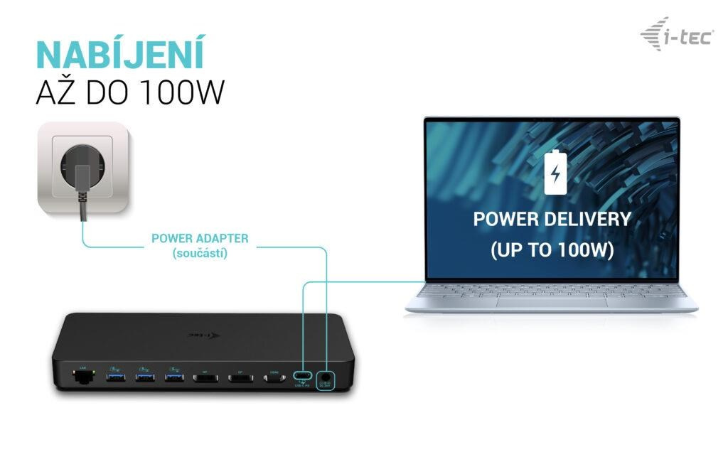 - Dokovacia stanica podporuje až 100W napájanie pripojeného notebooku alebo tabletu.