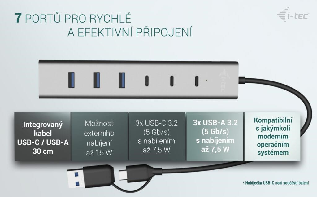 i-tec USB-C/USB-A Nabíjací kovový HUB 7 portov (3x USB-C, 4x USB-A)