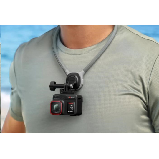 Pohodlný držák na krk pro kamery Insta360 GO 3S, GO 3, GO 2, X4, X3, ONE X2, Ace Pro 2 a ONE RS (4K i Twin edice) umožňuje natáčení z pohledu první osoby bez použití rukou. Má 360° otočnou základnu, rychlý uzamykací mechanismus a měkký, prodyšný silikon pro celodenní pohodlí.