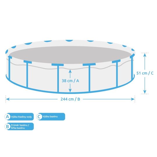 Uvádzané rozmery bazénu sú iba orientačné a ovplyvniť ich môže rovnosť podkladu či objem napustenej vody. Povolená výrobková odchýlka je 5 %.