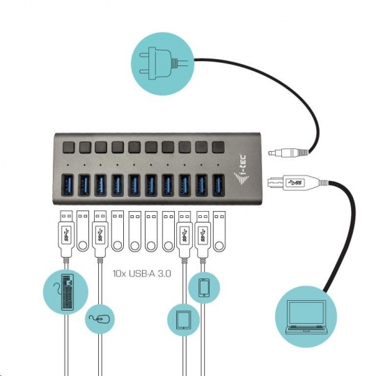 Tento HUB ponúka 10 USB 3.0 s funkciou Plug & Play a štandardným nabíjaním cez USB - HUB automaticky rozpozná, či je pripojené nabíjacie zariadenie USB. Vďaka tomu, že HUB má 10 USB 3.0, naraz možno nabíjať až 10 zariadení. USB 3.0 je dôležitý najmä pri prenose dát z USB 3.0 pamäťových kariet a flash diskov, kde je jeho vysoká prenosová rýchlosť najužitočnejšia. Súčasťou balenia je externý napájací adaptér, bez ktorého sa HUB nezaobíde. Napájací adaptér zaručuje stabilné nabíjanie z portov USB a napájanie z rozbočovača HUB a poskytuje nabíjací výkon až 10 W na port.