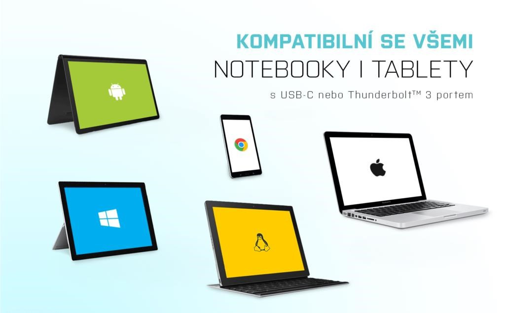 Káblový adaptér je vhodný na použitie so všetkými notebookmi, ktoré sú vybavené konektorom USB-C s podporou prenosu videa (režim DisplayPort alt) alebo konektorom Thunderbolt 3 (vrátane Apple MacBook 2015 alebo Apple MacBook Pro 2016 a novších). Konektory USB-C a Thunderbolt 3 majú viacero výhod.
