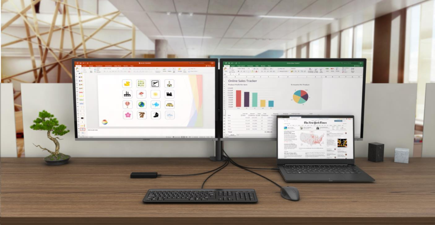 Kancelárska dokovacia stanica USB-C, ktorá podporuje až 2× externý monitor s rozlíšením 4K. Stanica je kompatibilná s akýmkoľvek notebookom vybaveným portom USB-C alebo Thunderbolt 3. 6x port USB, spoľahlivé a rýchle pripojenie k firemnej sieti vďaka integrovanému portu LAN, napájanie až do 100 W a podpora inštalácie za monitor, to všetko robí z tejto dokovacej stanice ideálneho spoločníka pre profesionálov.