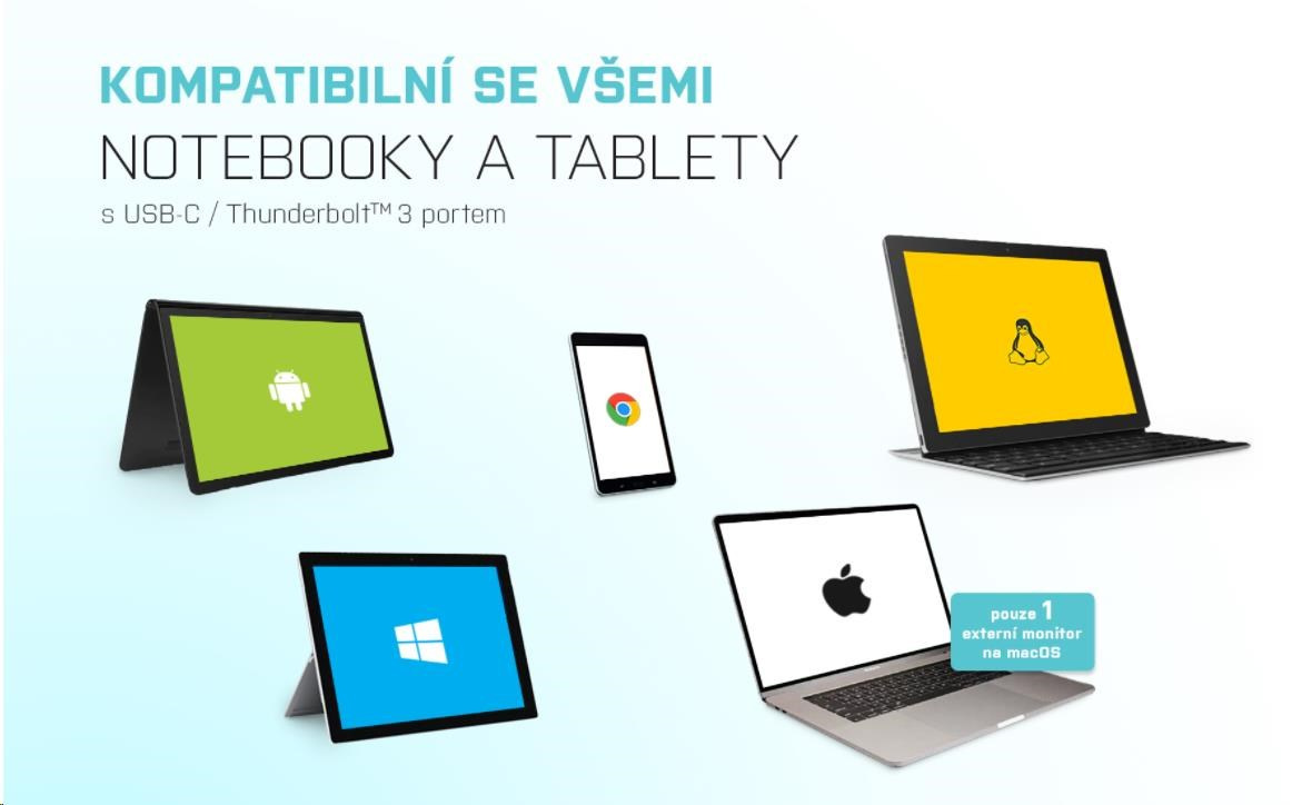 Táto dokovacia stanica je navrhnutá na použitie s akýmkoľvek notebookom, tabletom alebo smartfónom bez ohľadu na typ, značku alebo operačný systém. Potrebujete len voľný port Thunderbolt 3 alebo USB-C, ktorý dokáže prenášať videosignál.