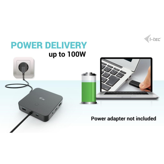 Poskytuje až 100W Power Delivery pre kompatibilné notebooky a tablety s rozhraním USB-C, USB4 a Thunderbolt. Hostiteľské zariadenie musí podporovať USB-C Power Delivery.