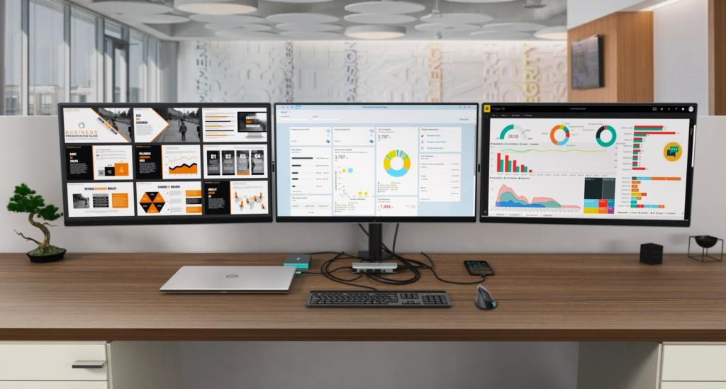 * Upozorňujeme, že možnosť pripojenia troch externých monitorov závisí od grafickej karty notebooku, hoci väčšina súčasných grafických kariet (vrátane integrovaných kariet Intel) to zvládne. Ak však chcete výstup videa na tri monitory, veko notebooku musí byť zatvorené.