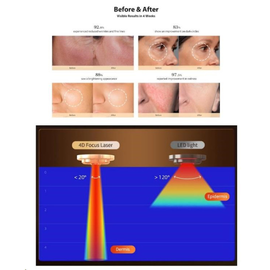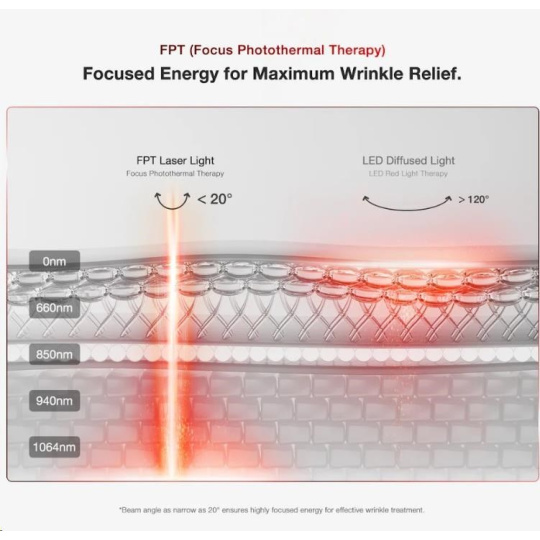 Zatiaľ čo väčšina domácich masiek využíva technológiu LED, JOVS 4D ide o krok ďalej. Využíva pokročilú FPT (Focal Photothermal Therapy) technológiu, ktorá koncentruje energiu laseru do úzkych paprskov s uhlom menším než 20°, na rozdiel od viac než 120° u bežných LED. Vďaka tomu prenikajú oveľa hlbšie do dermis – vrstvy pokožky, kde vzniká kolagén. Vďaka 6x vyššej energetickej účinnosti v porovnaní s LED diodami dokáže laser účinnejšie stimulovať bunkovú obnovu a cielene riešiť príčiny starnutia pleti.
