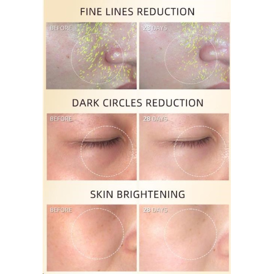 - Klinicky overené zníženie vrások okolo očí o 24,56% a tmavých kruhov o 29,41% za 28 dní.