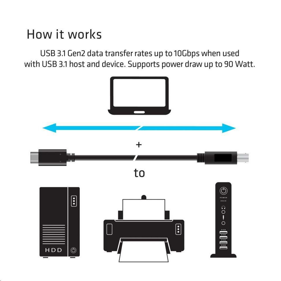 - Pripojí zariadenie typu USB-B k notebookom, tabletom a ultrabookom s rozhraním USB-C 3.1.