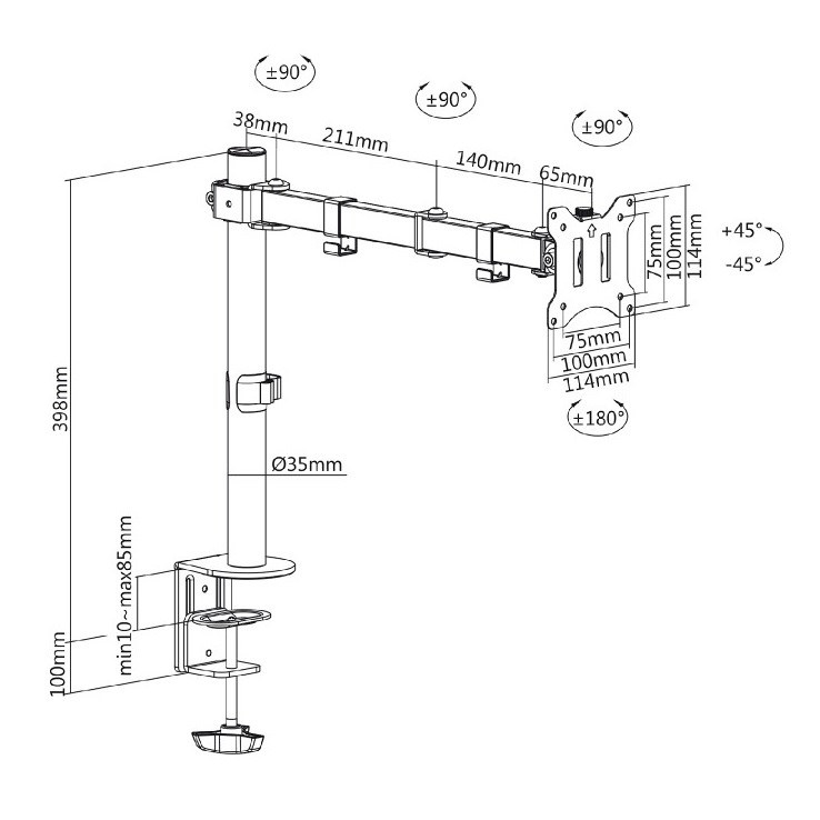 Kancelársky držiak na monitory Fiber Mounts M8C83 Stolový držiak na monitory 15-32", polohovateľný, stabilný, spoľahlivý, VESA 75x75 a 100x100, nosnosť 8kg Stolový držiak na monitory do kancelárií a študovní na monitory 15-32". Držiak umožňuje jednoduché polohovanie monitoru do potrebnej pozície: otáčanie do strán +360° / -360°, nakláňanie +45° / -45°, vzdialenosť monitora od nosníka (trubky) 83-430mm, výškové polohovanie po celej dĺžke nosníka (trubky) max. 300mm. Držiak podporuje VESA 75x75 a 100x100. Držiak môžete upevniť na okraj stola alebo na stolovú dosku (priechodka alebo vyvŕtať 1 otvor 10mm). Farebné prevedenie čierne, záruka 5 rokov. Stolový držiak na monitory, otočný, sklopný, výsuvný a výškovo polohovateľný Fiber Mounts M8C83 Technické údaje: nosnosť 8kg podporuje VESA štandardy 75x75 a 100x100 na monitory s uhlopriečkou 15" až 32" otáčanie do strán +/- 360° naklápanie +/- 45° výsuv od nosníka 83mm až 430mm výškové polohovanie 300mm kvalitná pevná konštrukcia úchyty na káble montáž na okraj stola alebo na stolovú dosku farba čierna záruka 5 rokov Kancelársky držiak na monitor Fiber Mounts M8C83 Držiak na monitor Fiber Mounts M8C83 podporuje VESA štandardy: VESA 75x75 VESA 100x100 Držiaky Fiber Mounts M8C83 sa stali populárne vďaka výbornému pomeru kvality a priaznivej cene. Držiak umožňuje jednoduché polohovanie monitora v širokom spektre. Držiaky sa osvedčili v kanceláriách, učebniach, ale aj domácnostiach.