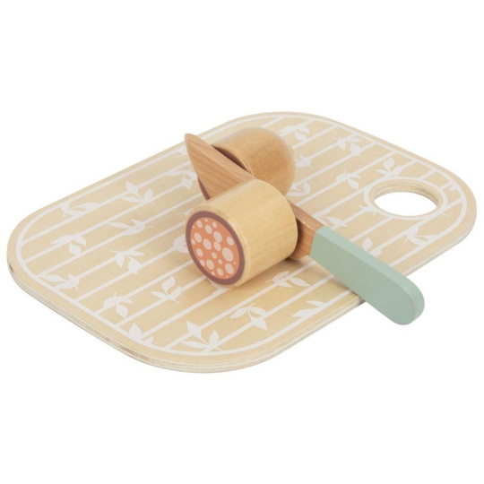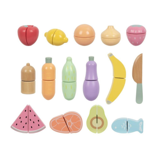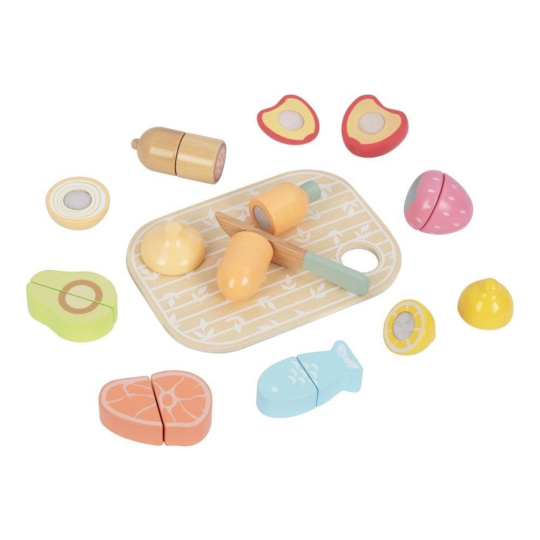 Sada drevených krájacích potravín uložená v praktickom a ľahko prenosnom boxe 3v1 umožní deťom pripraviť hostinu doma aj na návšteve. Krájacie ovocie, zeleninu a ďalšie potraviny môžu deti pomocou dreveného noža krájať (porciovať) na polovice a pomocou suchého zipsu polovice opäť spájať. S krájacími potravinami si deti vyskúšajú krájanie bezpečným detským spôsobom a zdokonalia svoje zručnosti.