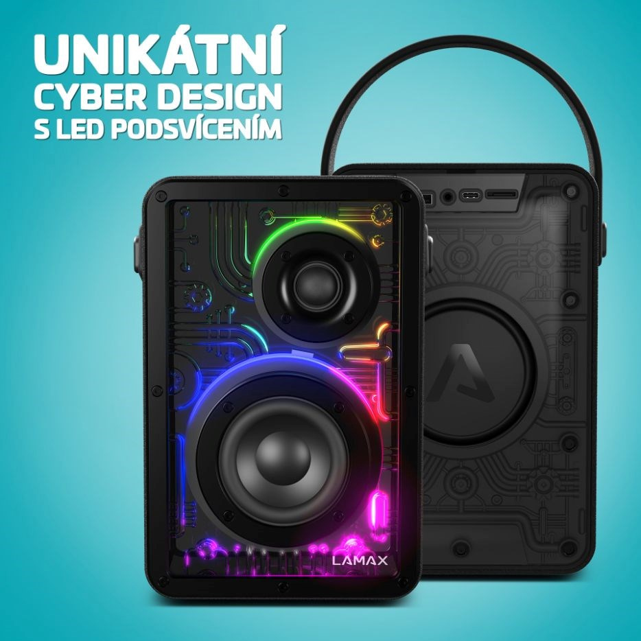 Usporiadaj večierok, na ktorý nikto nezabudne, alebo si vychutnaj počúvanie hudby a podcastov, ako keby bol interpret v miestnosti s tebou. Je to jednoduché, pretože na scénu prichádza LAMAX CyberWave1, párty reproduktor so 4 nastaviteľnými Cyber LED efektmi, ktoré každého ohúria. Jeho telo s dvojpásmovými reproduktormi duní výkonom až 50 W a technológia BeatBass® ťa úplne pohltí úžasným zvukom, ktorý poskytuje. Reproduktor podporuje širokú škálu formátov aj pripojení a jeho moderné rozhranie Bluetooth 5.3 funguje skvele až do vzdialenosti 15 metrov a automaticky sa spáruje s rôznymi zariadeniami. Párty sa často pretiahnu, ale to nič, pretože batéria reproduktora vydrží až 20 hodín, potom ho stačí dobiť cez USB-C a ide sa ďalej. Tento reprák je veľký fešák v mobilnom Cyber dizajne s rukoväťou na jednoduché prenášanie. Jeho ovládanie je jednoduché a intuitívne. Užívaj si večierky pokojne aj vonku alebo pri bazéne, trochu vody reproduktoru neublíži. Je vodoodolný s ochranou IPX5.